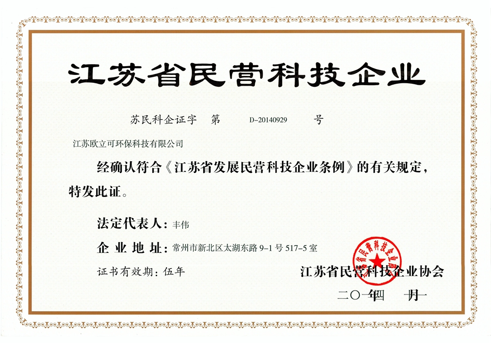 熱烈祝賀江蘇歐立可環(huán)保科技有限公司獲得江蘇省民營科技企業(yè)稱號!