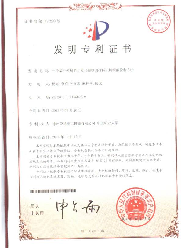 新獲國(guó)家批準(zhǔn)的專利名稱為:一種基于模湖PID復(fù)合控制的冷再生機(jī)噴灑控制方法,該發(fā)明專利由我公司與中國(guó)礦業(yè)大學(xué)聯(lián)合開(kāi)發(fā),專利權(quán)由雙方共有。該項(xiàng)專利早已在我公司生產(chǎn)的路面冷再生機(jī)上獲得應(yīng)用。路面冷再生機(jī)的添加劑噴灑控制系統(tǒng)的**與穩(wěn)定對(duì)冷再生施工質(zhì)量有著決定性的影響,對(duì)于有經(jīng)驗(yàn)的路面冷再生行業(yè)人士來(lái)說(shuō)是深有體會(huì)。我公司冷再生機(jī)噴水系統(tǒng)具有計(jì)量準(zhǔn)確,流量穩(wěn)定的特點(diǎn),深受廣大用戶的好評(píng),這是我公司堅(jiān)持走技術(shù)創(chuàng)新,掌握了核心技術(shù)的結(jié)果。得益于持續(xù)不斷的技術(shù)創(chuàng)新,我公司冷再生機(jī)產(chǎn)品在技術(shù)水平上已處于國(guó)內(nèi)領(lǐng)先地位,產(chǎn)品銷量也迭創(chuàng)新高,同樣國(guó)內(nèi)領(lǐng)先。堅(jiān)持技術(shù)創(chuàng)新,保持產(chǎn)品性能優(yōu)勢(shì)是徐州銳馬重工一貫的宗旨,與進(jìn)口機(jī)械一爭(zhēng)高下,促進(jìn)國(guó)內(nèi)路面冷再生事業(yè)的健康發(fā)展是徐州銳馬重工不變的目標(biāo)。